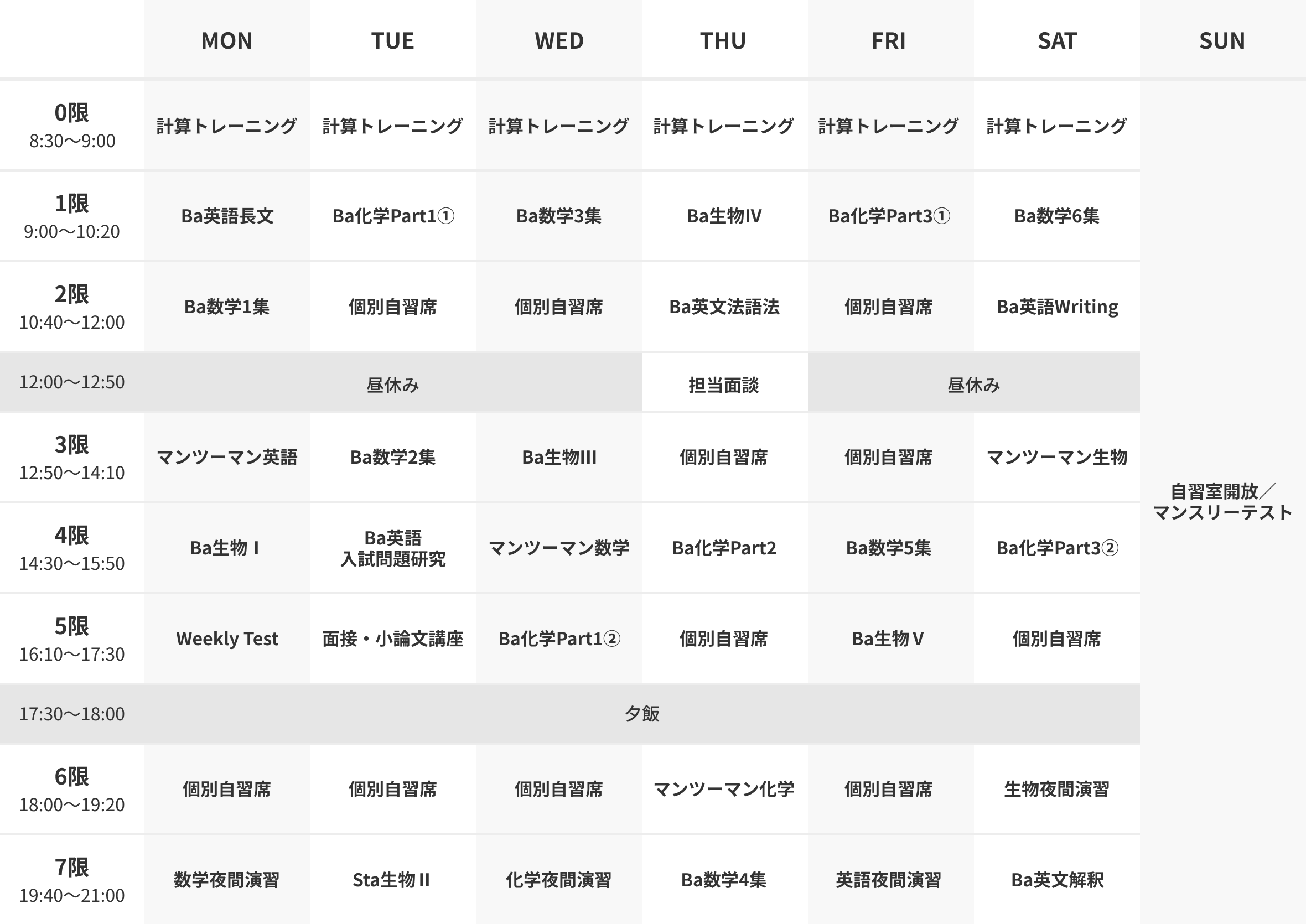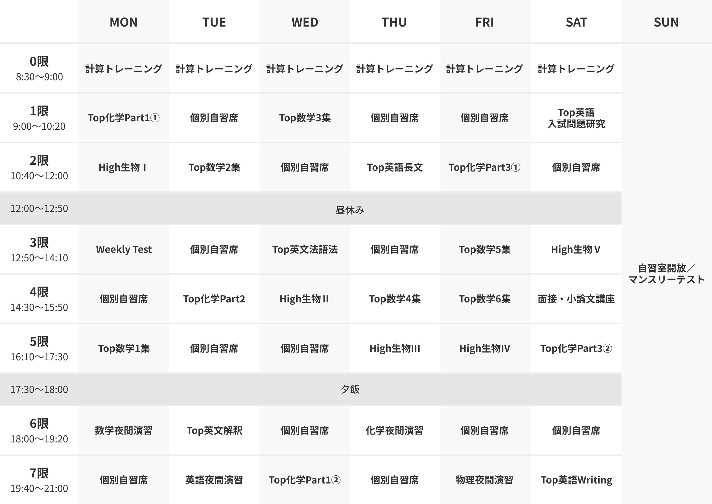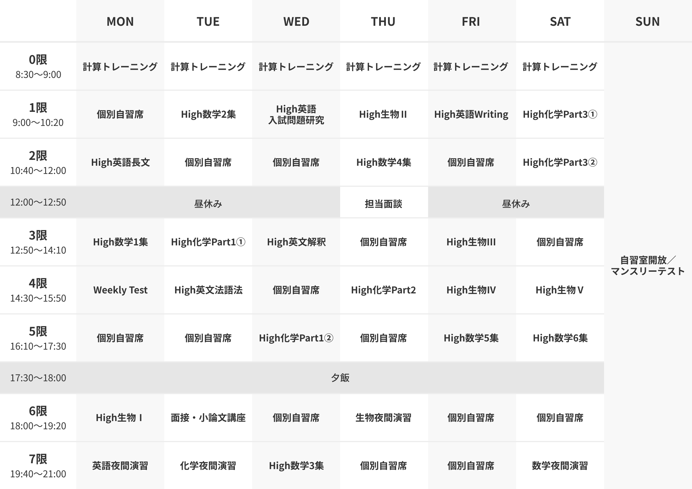 ※ 上記は生物選択の場合の時間割例です。物理選択の場合、時間割の生物が物理になります。