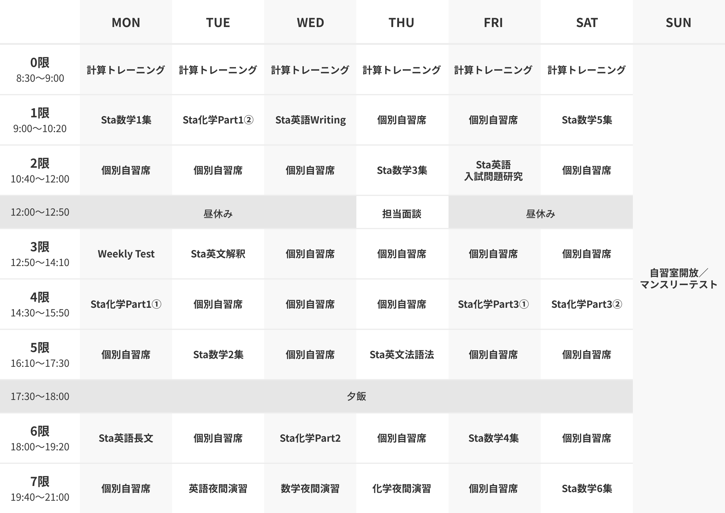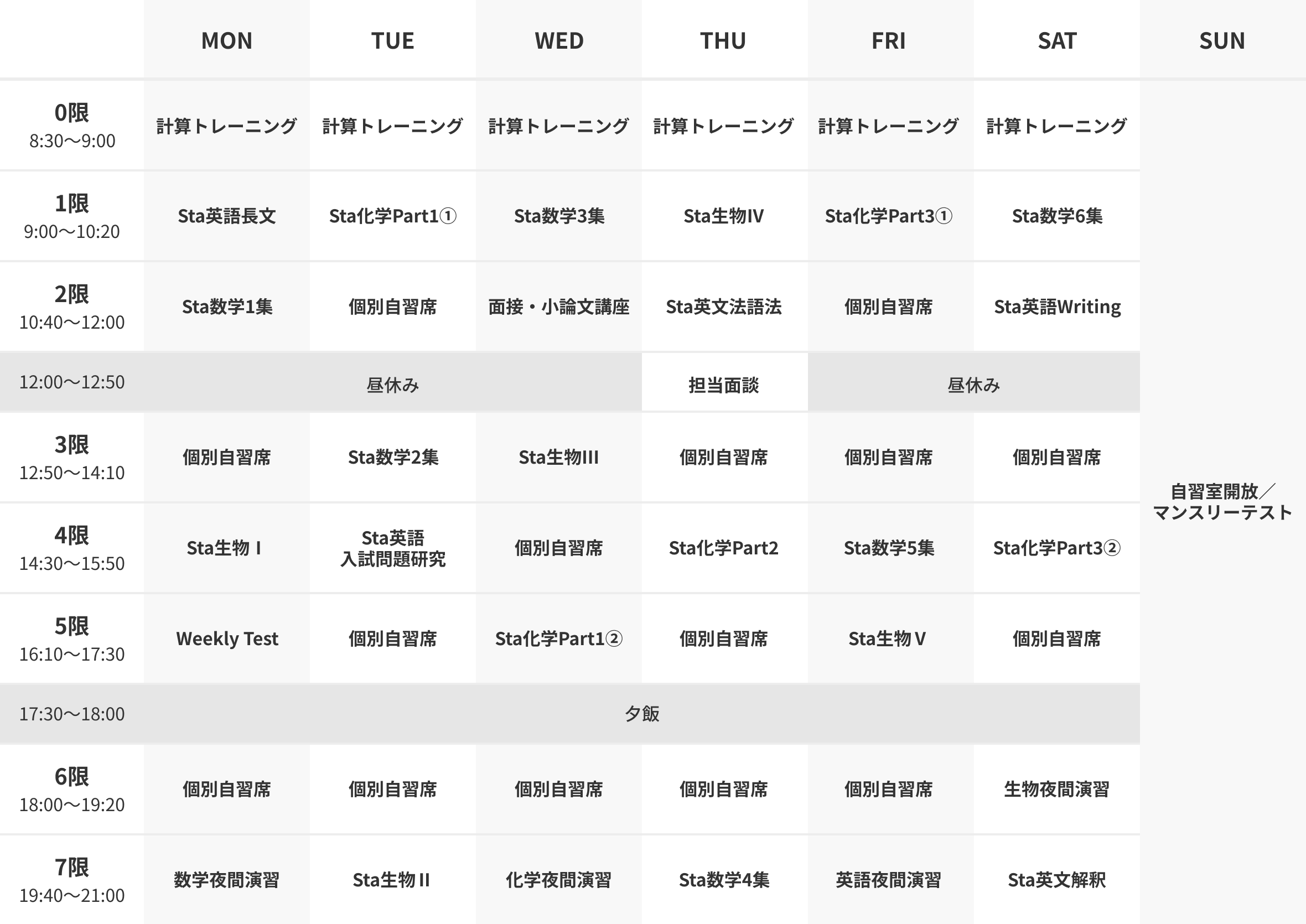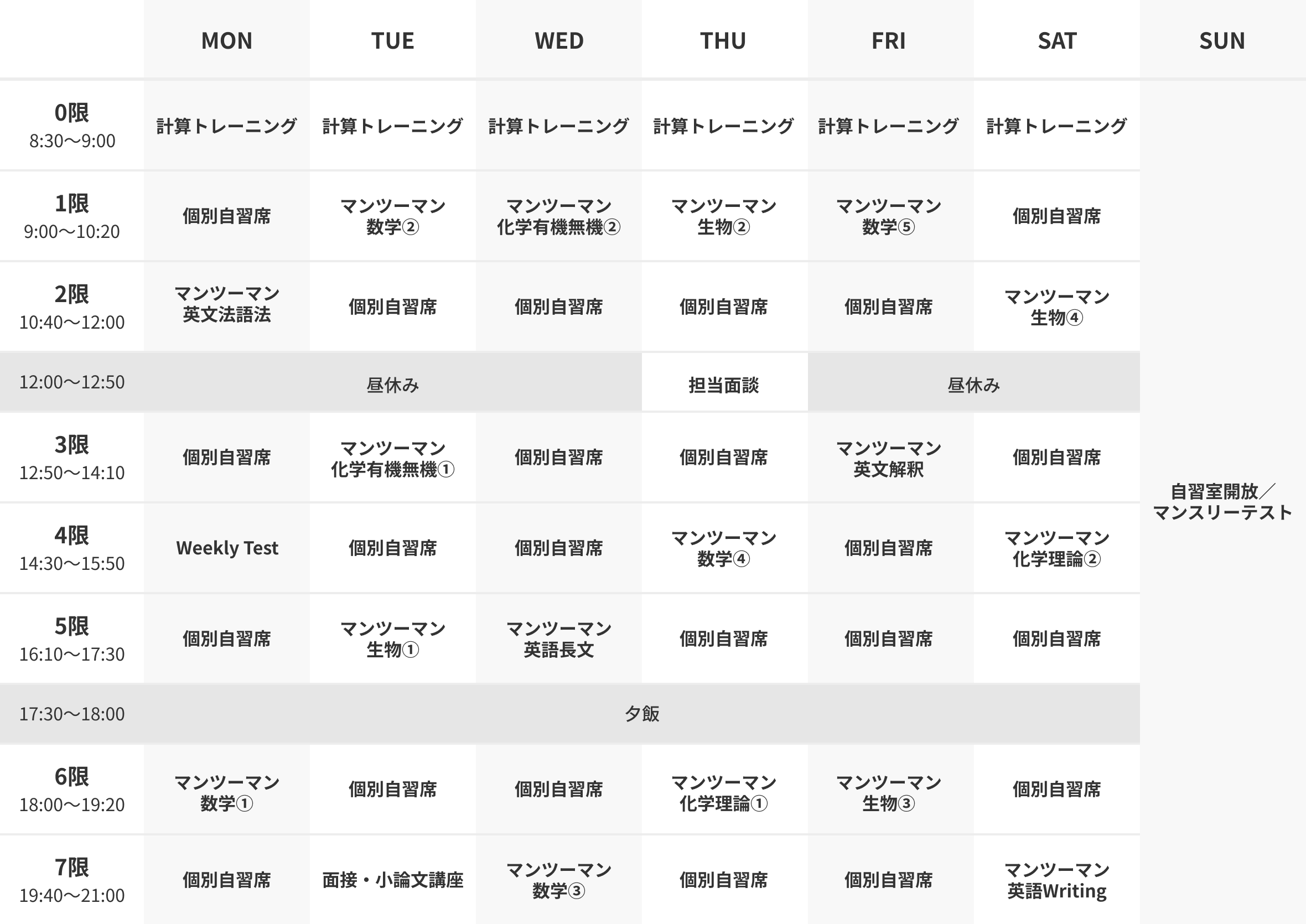 ※ 上記は生物選択の場合の時間割例です。物理選択の場合、時間割の生物が物理になります。