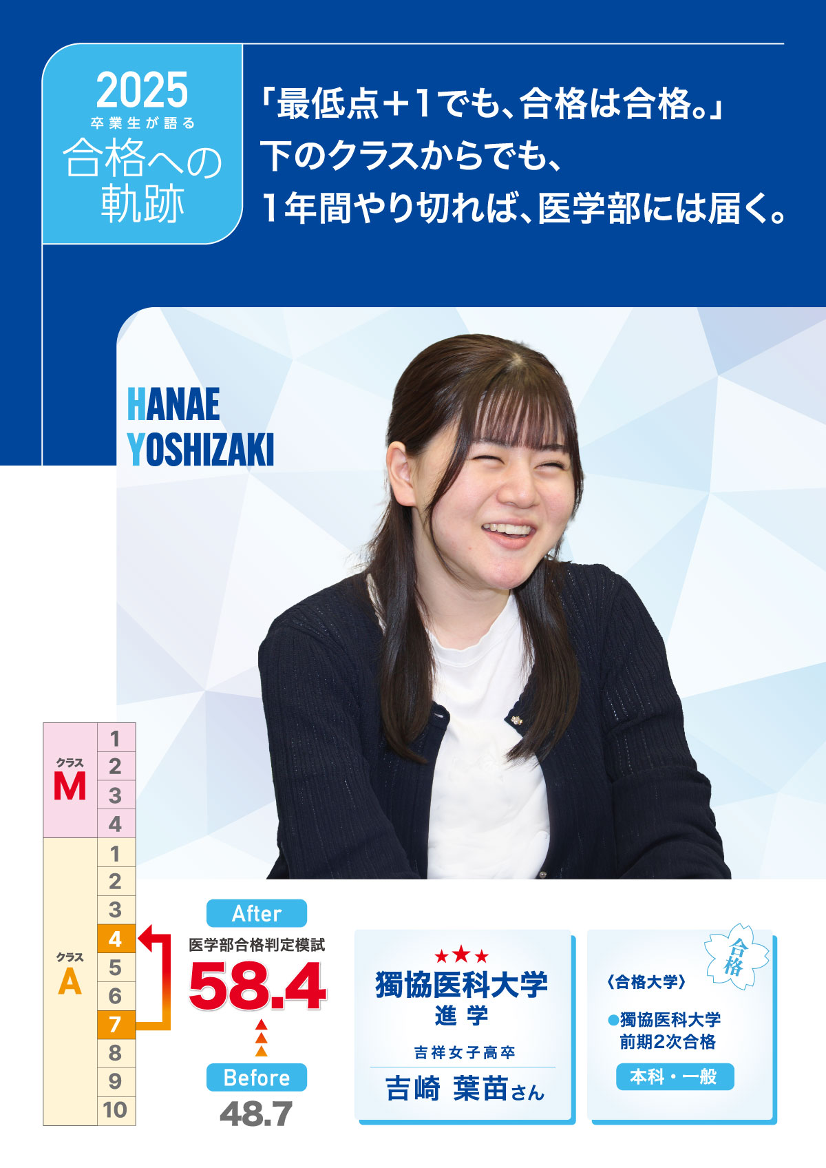 「1校受かればいい。最低点に引っかかれば、それで合格なんです。」そう語るのは、吉祥女子高校出身の吉崎葉苗さん。獨協医科大学前期に2次合格。“完璧”を求めず、“合格に必要なこと”に集中した1年だった。