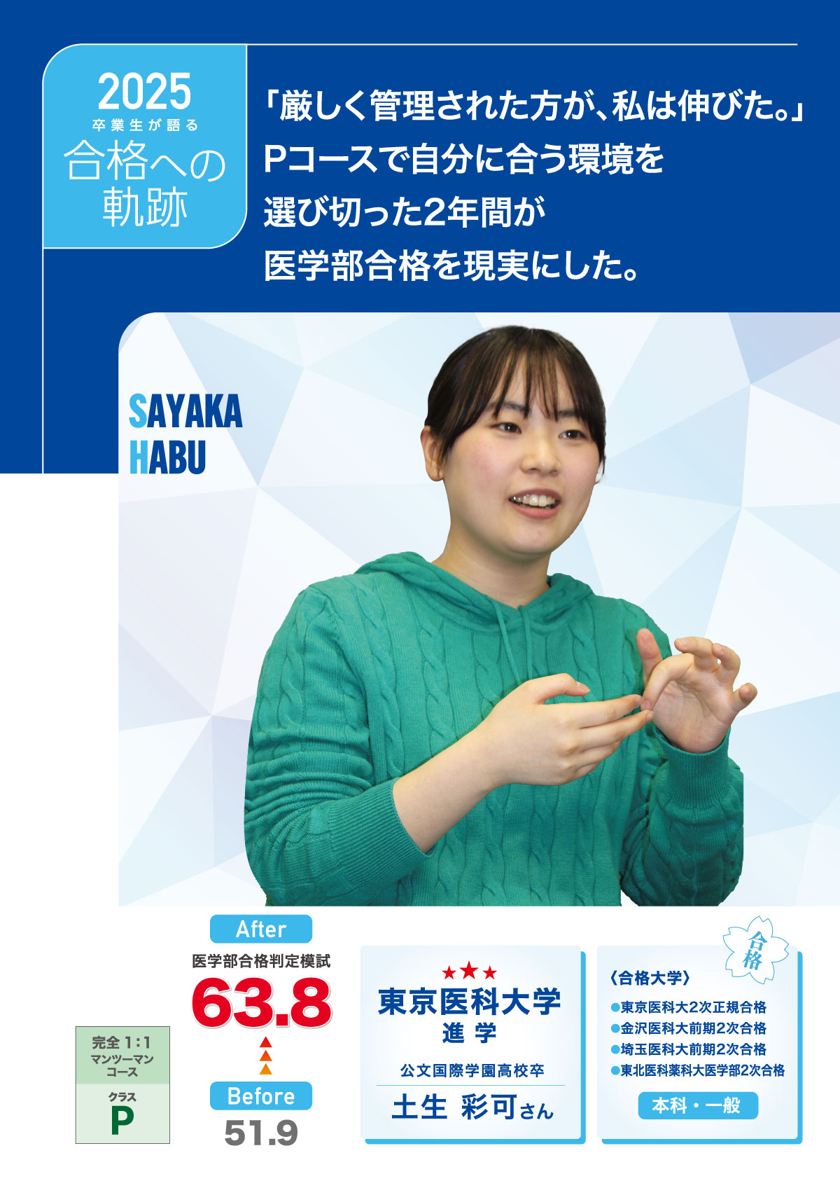Pコースでの徹底管理、厳しいマンツーマン指導、生物・化学の飛躍と英数の立て直し。 代官山MEDICALでの2年間が、土生さんを東京医科大学合格へと導いた。「代官山MEDICALに来て、言われたことをやっておけば大丈夫。結局、その環境が一番自分に合っていました。」金沢医科大学・埼玉医科大学・東北医科薬科大学にも2次合格し、 2年間の受験を実力で締めくくった。