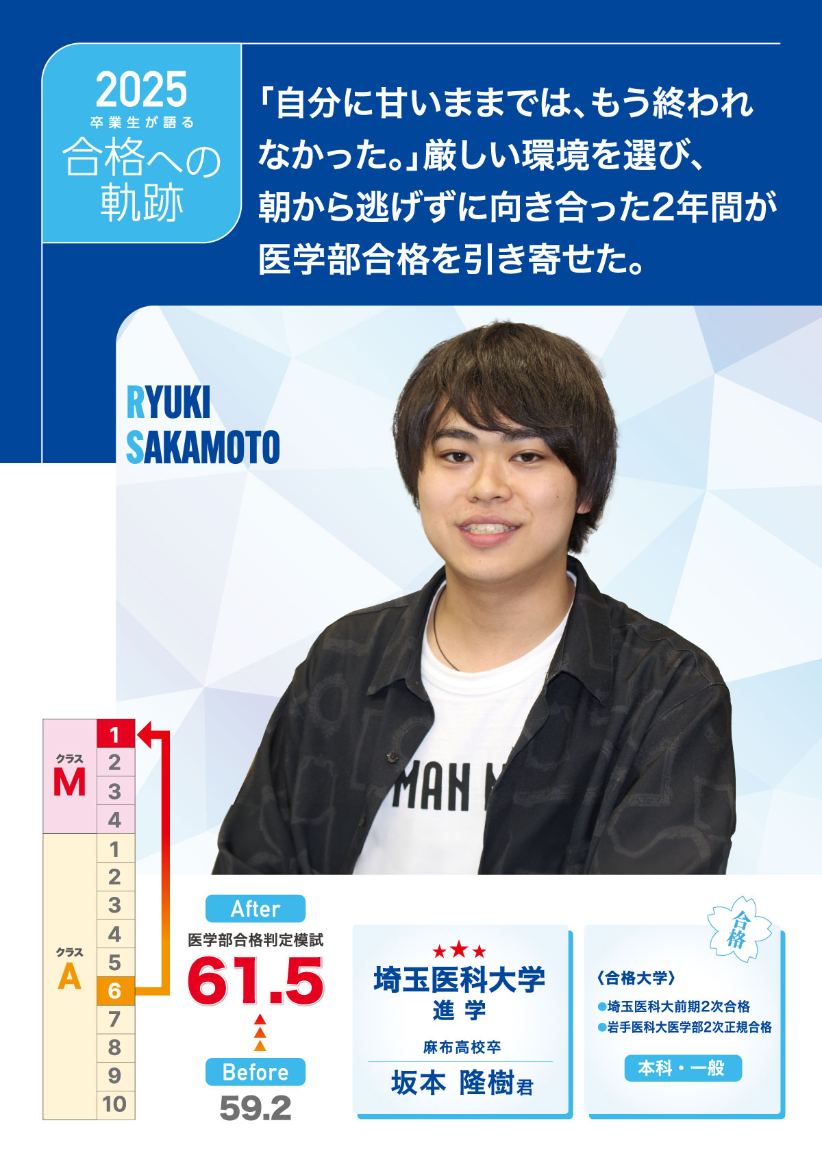 管理された学習、仲間との協力、朝型への転換、苦手克服。代官山MEDICALでの2年間が、坂本隆樹くんを埼玉医科大学・岩手医科大学合格へと導いた。「自分に厳しく、1年間やり切ろう。そう決めたから、代官山MEDICALを選びました。」麻布高校卒の坂本君は“甘さ”と決別する覚悟が、合格への第一歩だった。