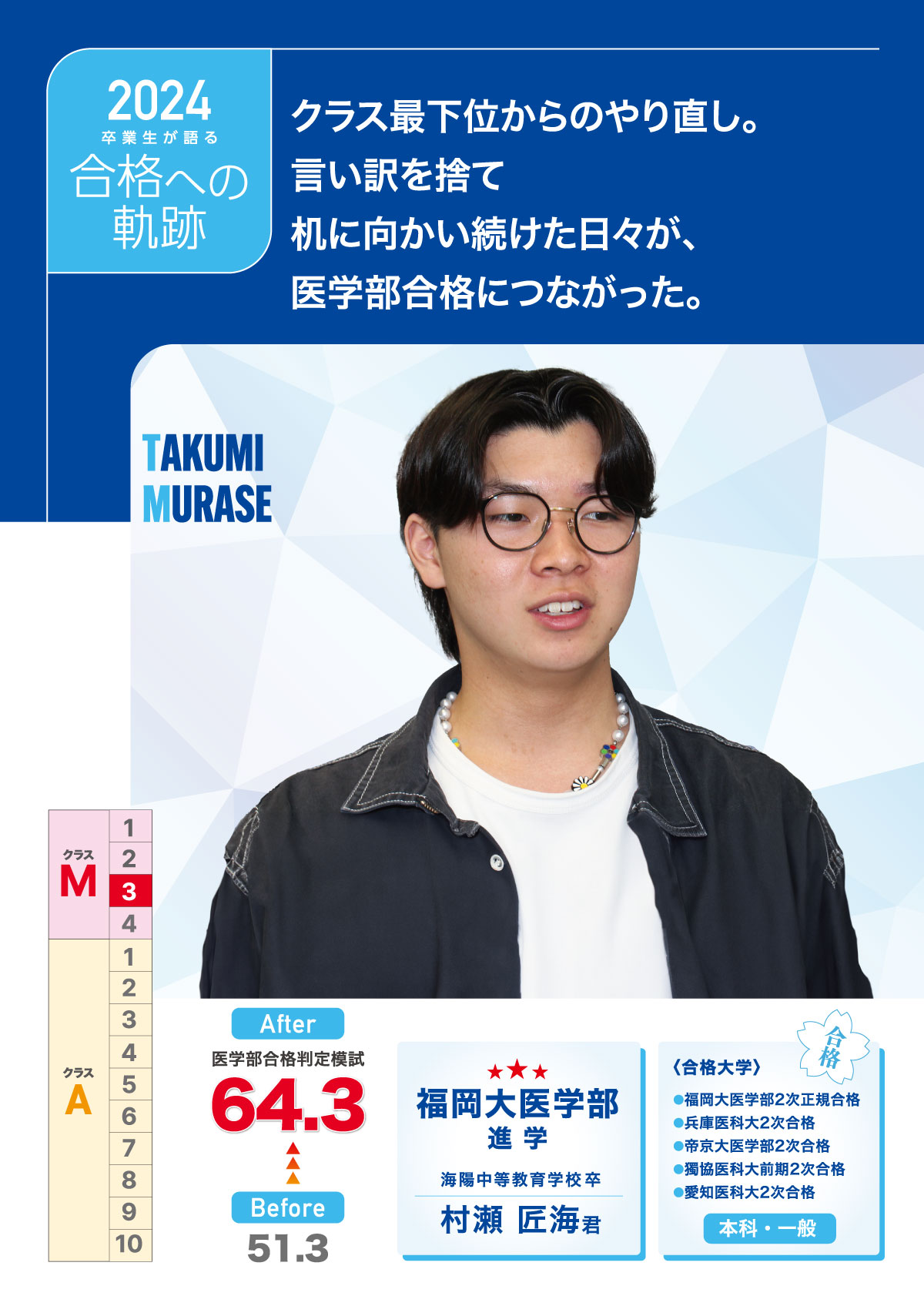 マンスリーテスト最下位、環境の見直し、親との距離感。代官山MEDICALで「自分と向き合う力」を身につけた1年が、村瀬君を福岡大学医学部合格へと導いた。「代官山MEDICALに来て、一番変わったのは自分の中で言い訳を作らなくなったことだと思います。」そう語る村瀬君の合格への道のりは、順調とは言えないものだった。