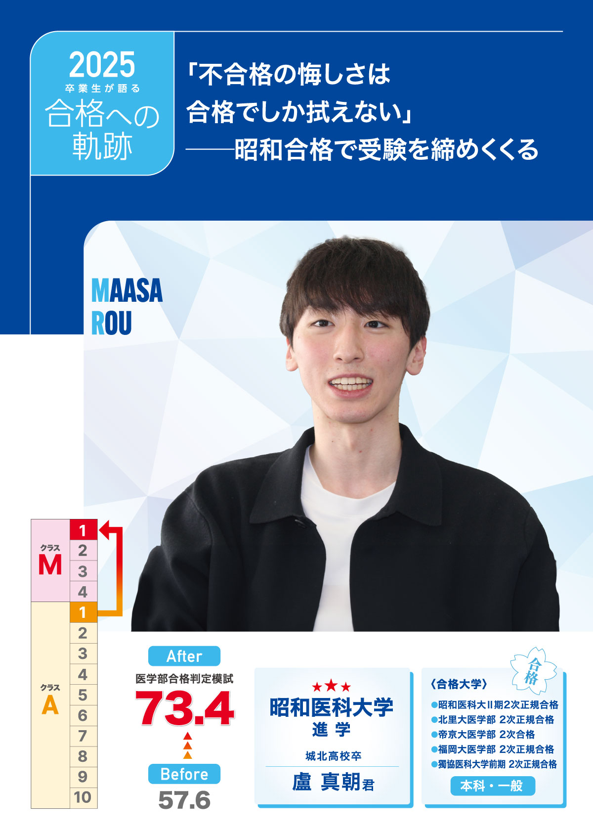 そう語るのは、城北高校を卒業し、昭和医科大学への進学を決めた盧 真朝くん。北里・帝京・福岡・獨協医科大学など複数校で二次合格を勝ち取り、後期試験の最後を“昭和合格”で終えた。「最後を昭和の合格で締めくくれたのは、良い終わり方だったと思います。」と静かに振り返る。
