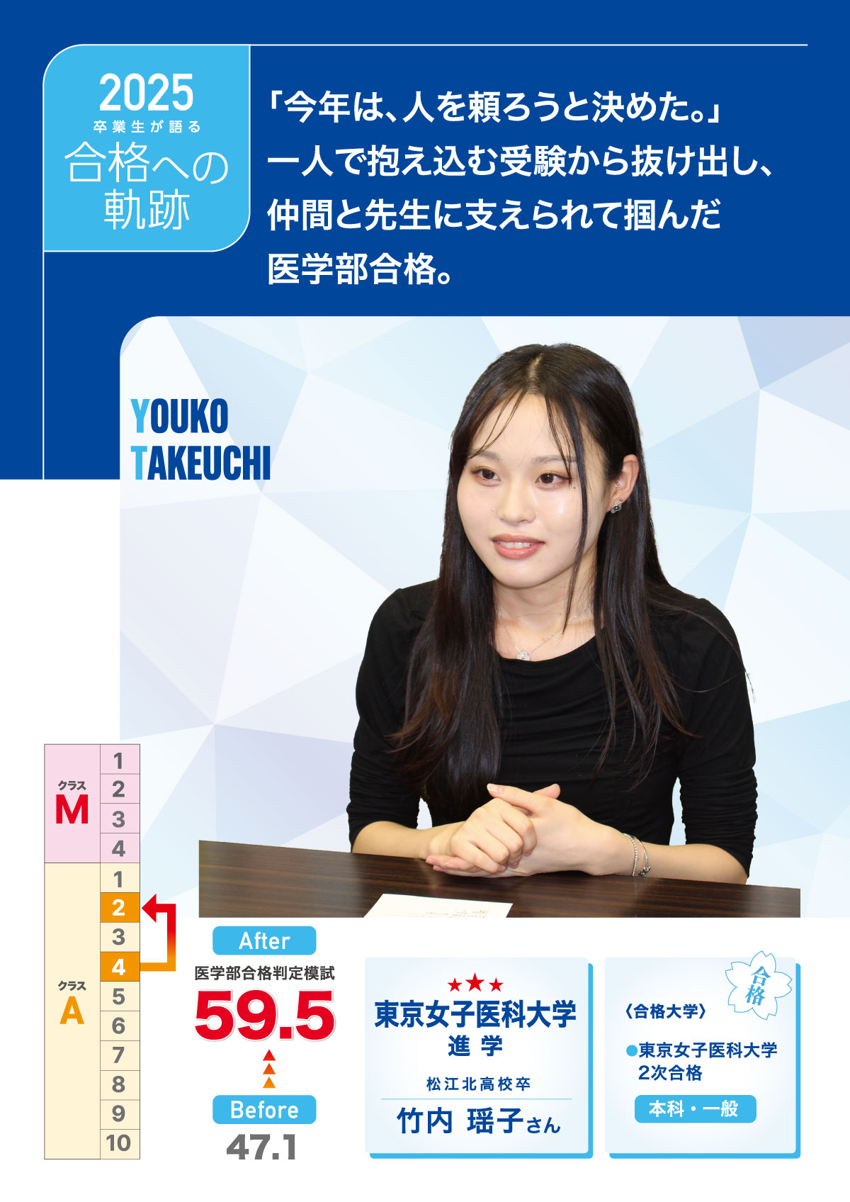 代官山MEDICALでの1年間が、竹内さんを東京女子医科大学合格へと導いた。「今年は、人を頼るようにしていました。」それまで“1人で頑張る受験”を続けてきた彼女が、代官山MEDICALで大きく変わった1年だった。
