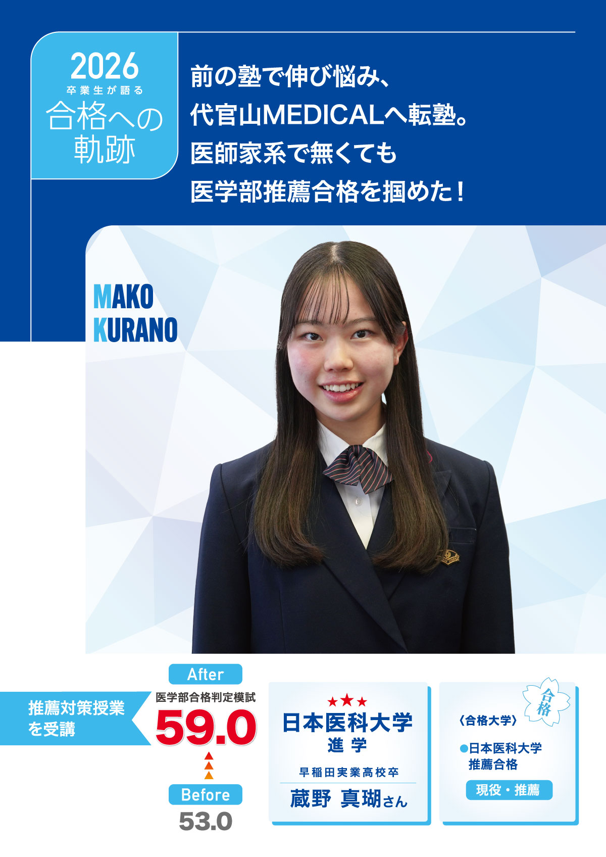 蔵野さんは最後にこう話す。「講師の先生方を信じて、自分の弱点と向き合えば、絶対に伸びます。安心して代官山MEDICALで頑張ってほしいです。」