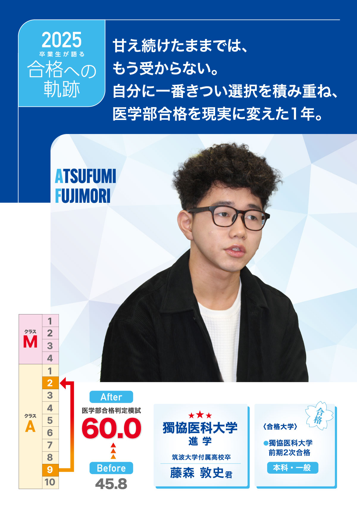 厳しい環境への覚悟、ウィークリーテストとマンスリーテストによる競争、量と質を両立させた学習、仲間と講師陣の支え。代官山MEDICALでの1年間が、藤森君を獨協医科大学合格へと導いた。「甘えてきた人生だったと思います。だから代官山MEDICALでは、あえて一番きつい選択をしようと決めました。」